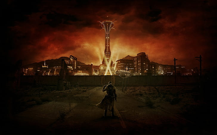 The sun had at last gone down, and Flint didn’t like the idea of being stalked by the things that lurked in the freezing Mojave nights. Climbing up to the peak of a ridge, trying to find a safe place to make camp, his mouth suddenly went agape as his eyes met with the mesmerizing sight to the southwest. Hundreds of points of light, more than he had ever seen before. Intact skyscrapers surrounded by a concrete wall, pristine and untouched by the atomic devastation that was evident in the surrounding areas. Beacons of light shone high into the night sky, illuminating what seemed to be the crowning jewel of the place he recognized as New Vegas. He stood in place for a few minutes, drinking in the view. He had heard stories about the newly discovered oasis during his travels but wrote them off as being exaggerated lies from NCR propagandists, intent on justifying yet another annexation war. Even though he received the mission brief before starting his mission, reliable intel about New Vegas was scarce. That was why he was there, after all.